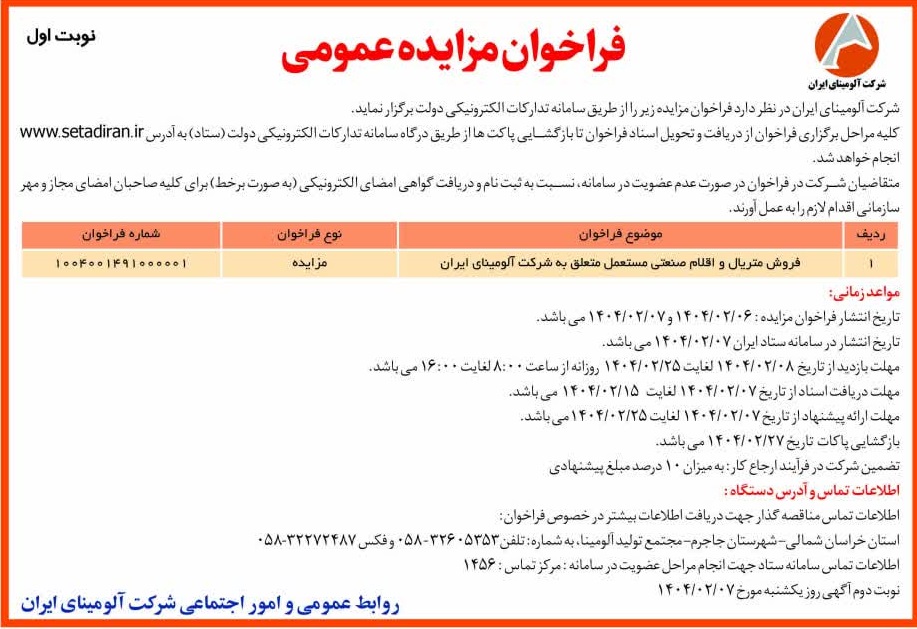 Home page / Tender / Printing and publishing an advertisement for a public auction for the sale of used industrial materials and items belonging to Iran Alumina Company in the Donyayeh Eqtesad and Atrak newspapers.