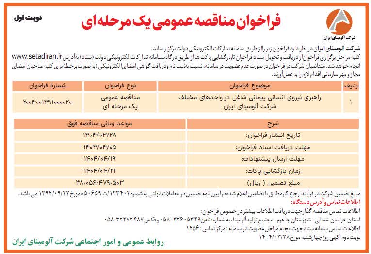 Home page / Tender / Printing and publishing a tender announcement on the subject of managing human resources working in various departments of Iran Alumina Company in Donyay Eqtesad and Atrak newspapers