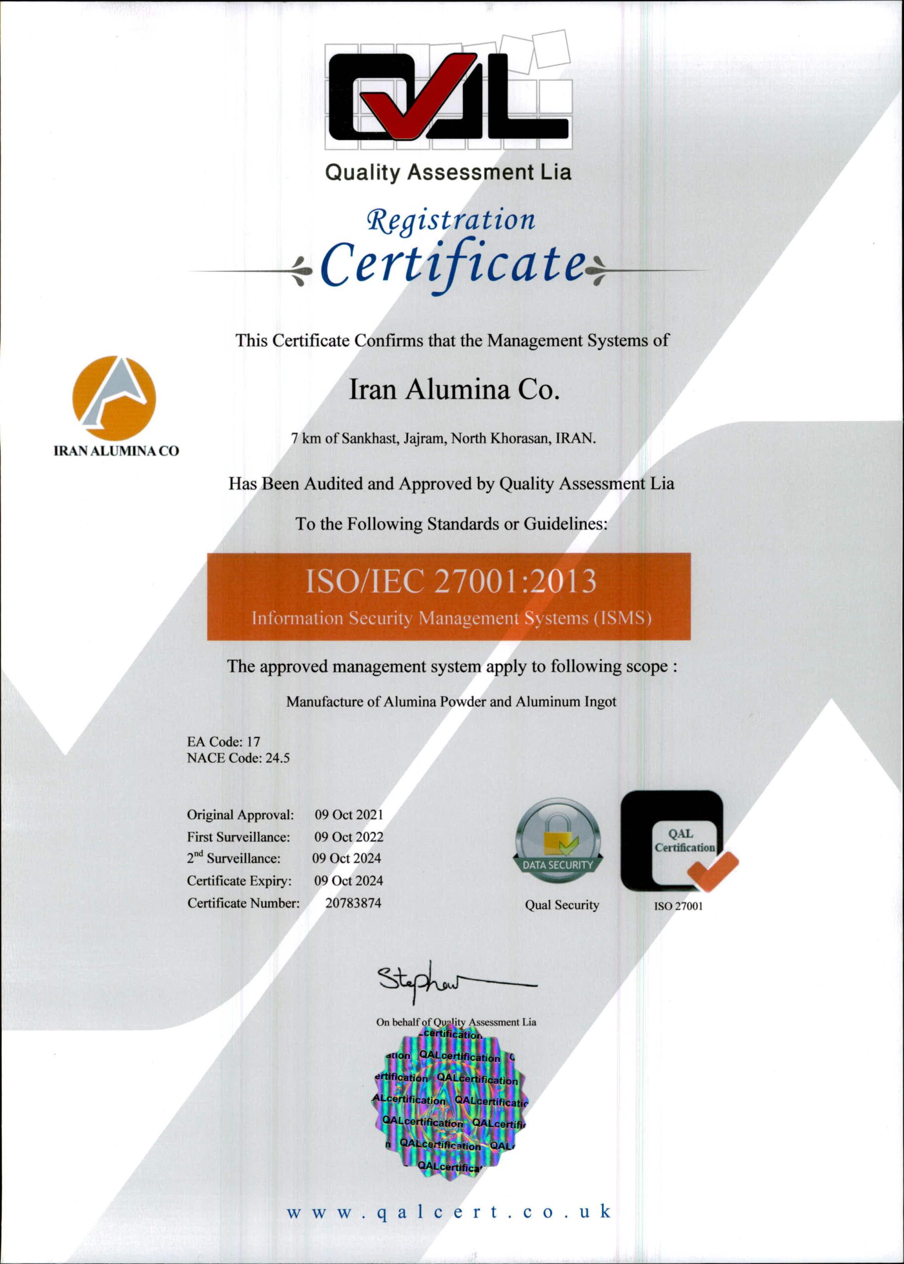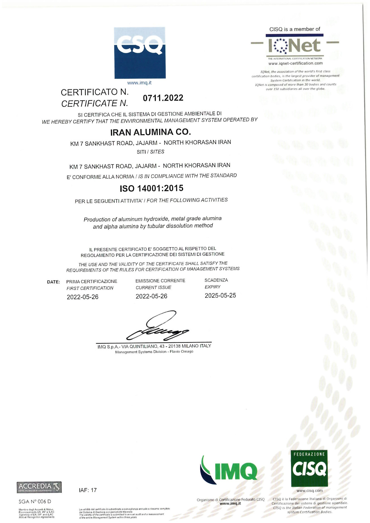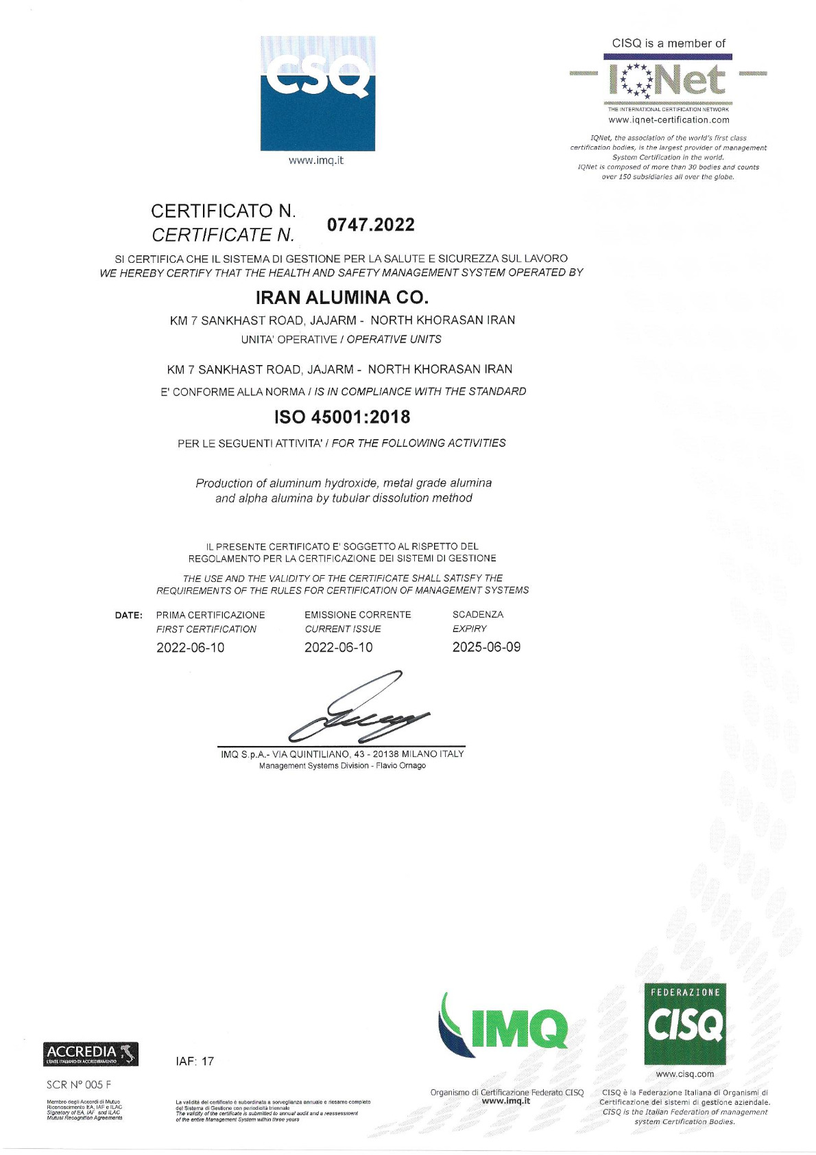 Iran Alumina Company started establishing an Integrated Management System (IMS) with the help of a consultant in 2005 and has so far succeeded in receiving international certificates during four three-year periods. The CBs of the previous two periods were URS England and currently IMQ Italy. The validity of the last period of certificates is July 9, 2021.