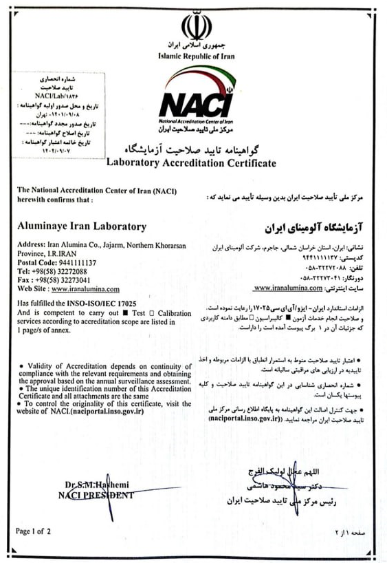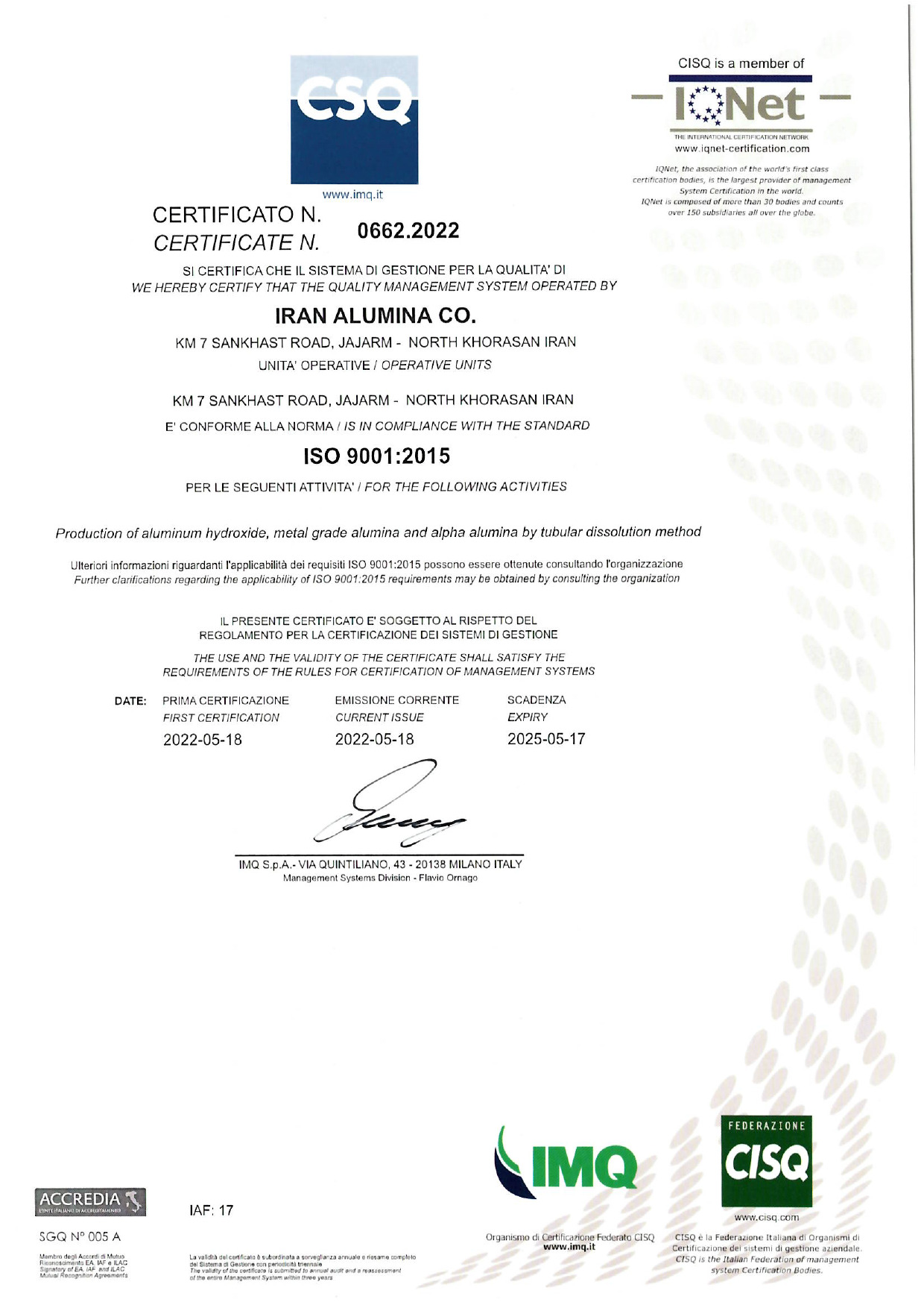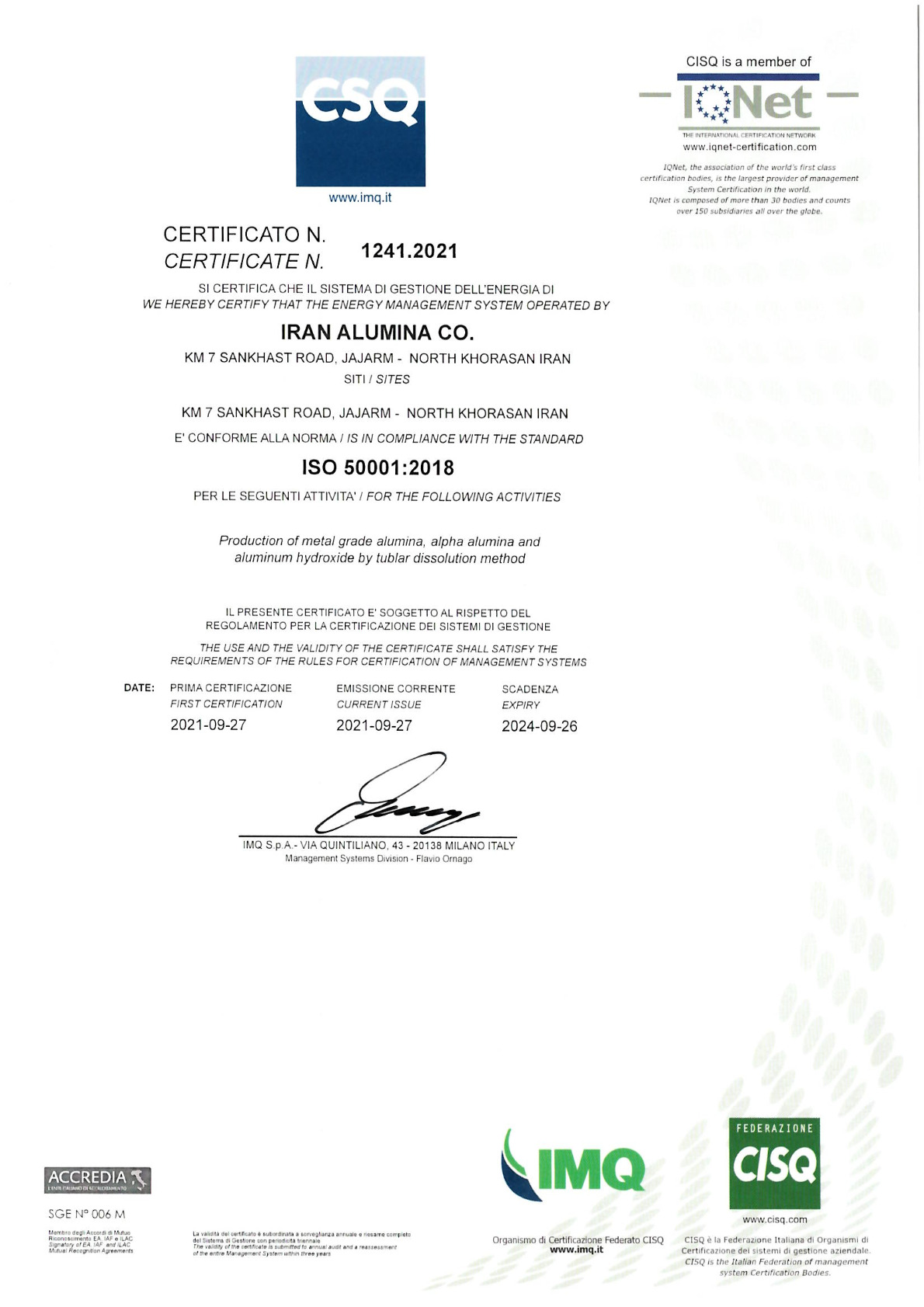 Iran Alumina Company started establishing an Integrated Management System (IMS) with the help of a consultant in 2005 and has so far succeeded in receiving international certificates during four three-year periods. The CBs of the previous two periods were URS England and currently IMQ Italy. The validity of the last period of certificates is July 9, 2021.
